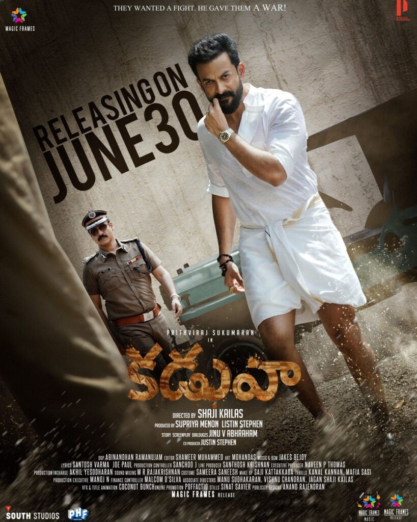 The makers came up with release date of the movie. As announced by them, Kaduva will be releasing worldwide in theatres on June 30th, Pan india entertainer coming in Malayalam, Telugu, Tamil, Kannada and Hindi